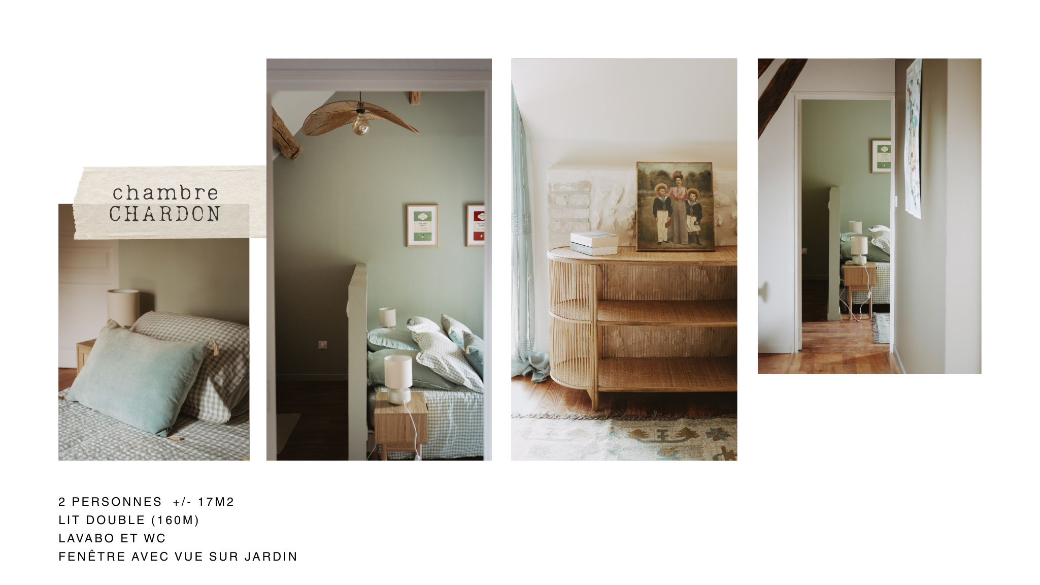 Collage of interior photos of a cozy bedroom with exposed wooden beams, white walls, and vintage furniture, labeled 'chambre LUZERNE'.